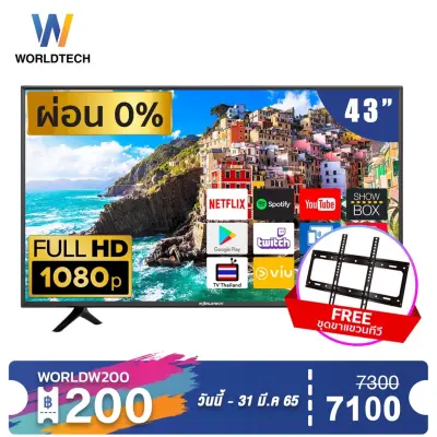 - ชื่อสินค้า Worldtech ทีวี 43 นิ้ว (รวมขอบ) Full HD Smart TV แอนดรอย สมาร์ททีวี + แถมฟรี ขาแขวนทีวี รับประกัน 1 ปี (ผ่อน 0%) **มีสินค้าพร้อมส่ง**